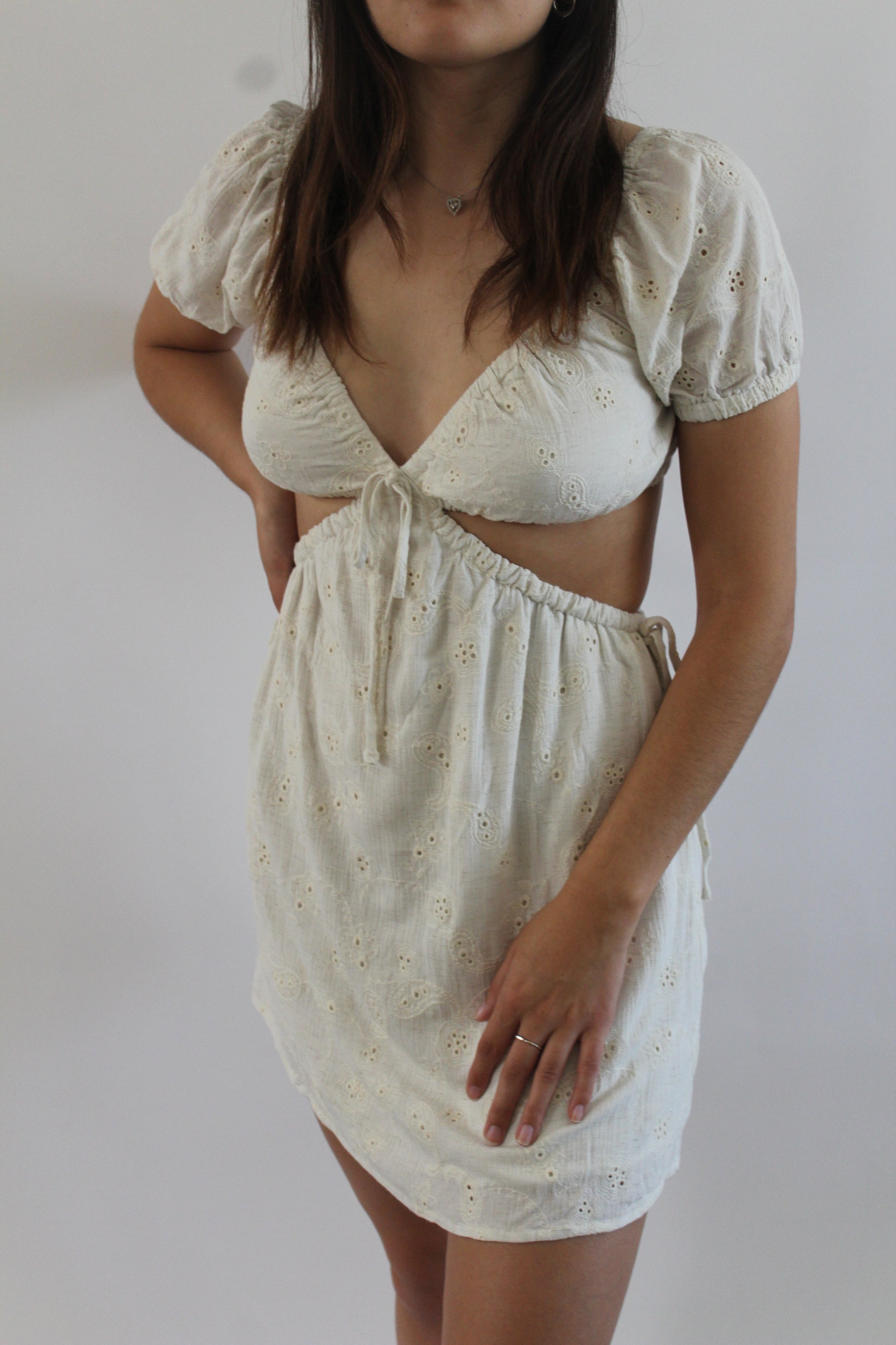 The most perfect summer time dress with an eyelet fabric in a paisley design. Very light weight and breathable. The cutout makes this dress so unique!