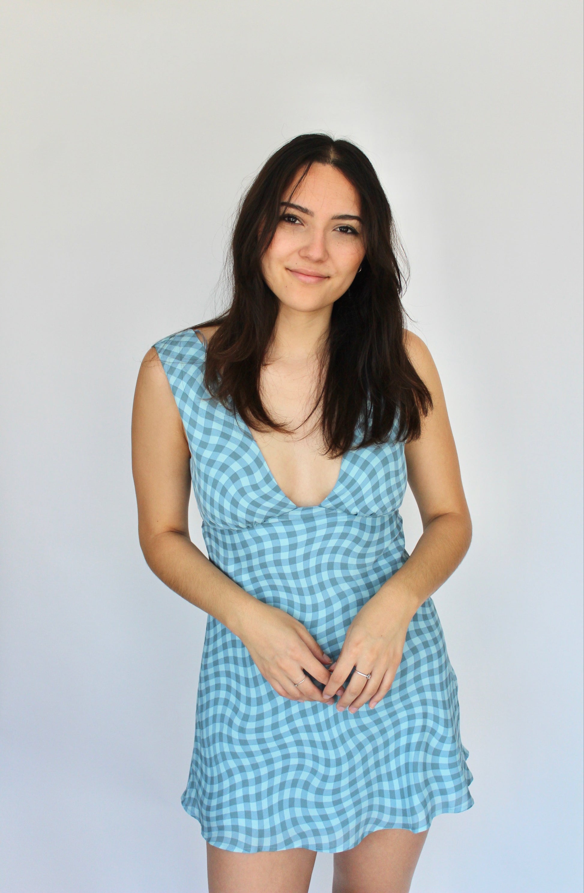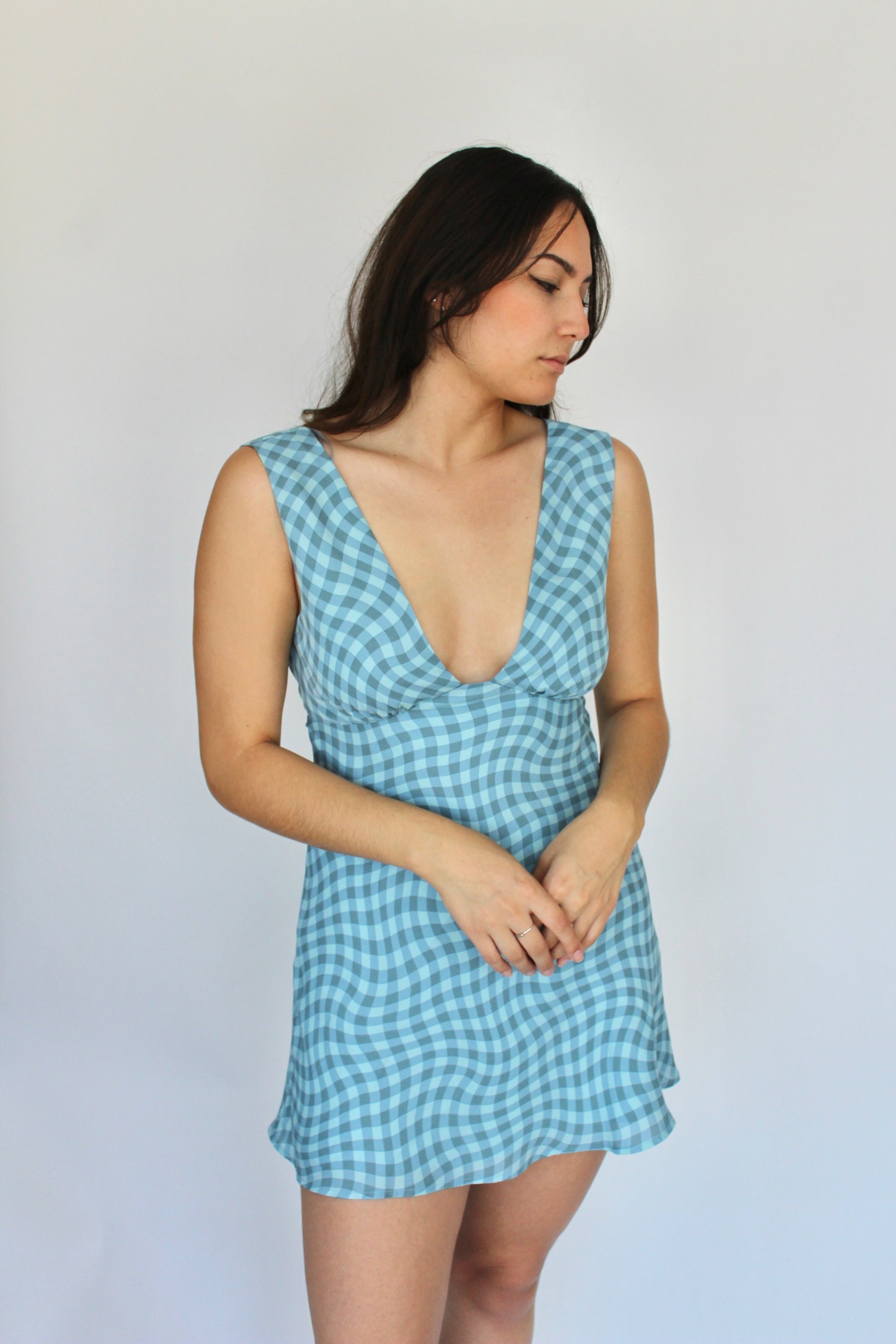 Deep V-neck flowy dress with a wavy gingham print. Back has the same deep v as the front as well as a tie and button to fit to your body shape. Also features extra lining under the skirt!
