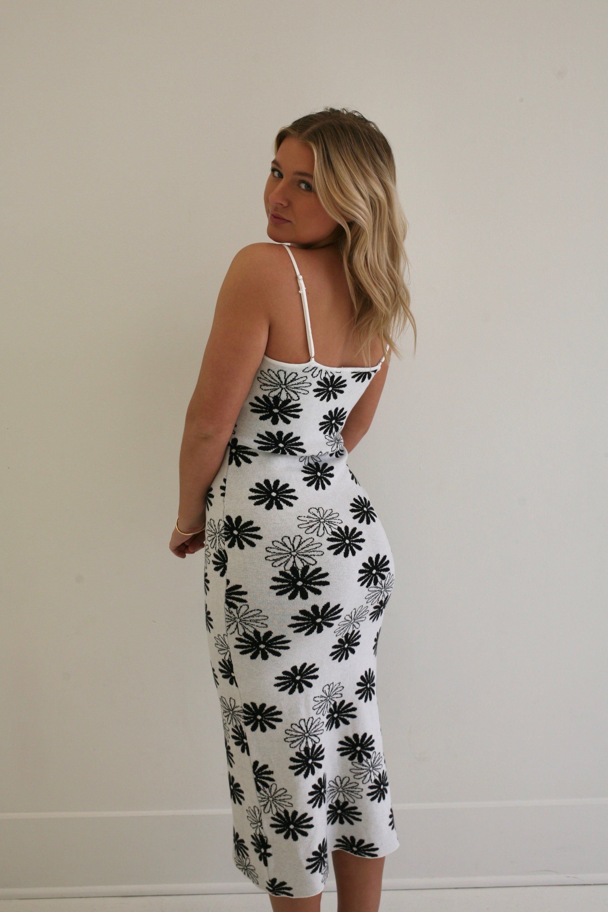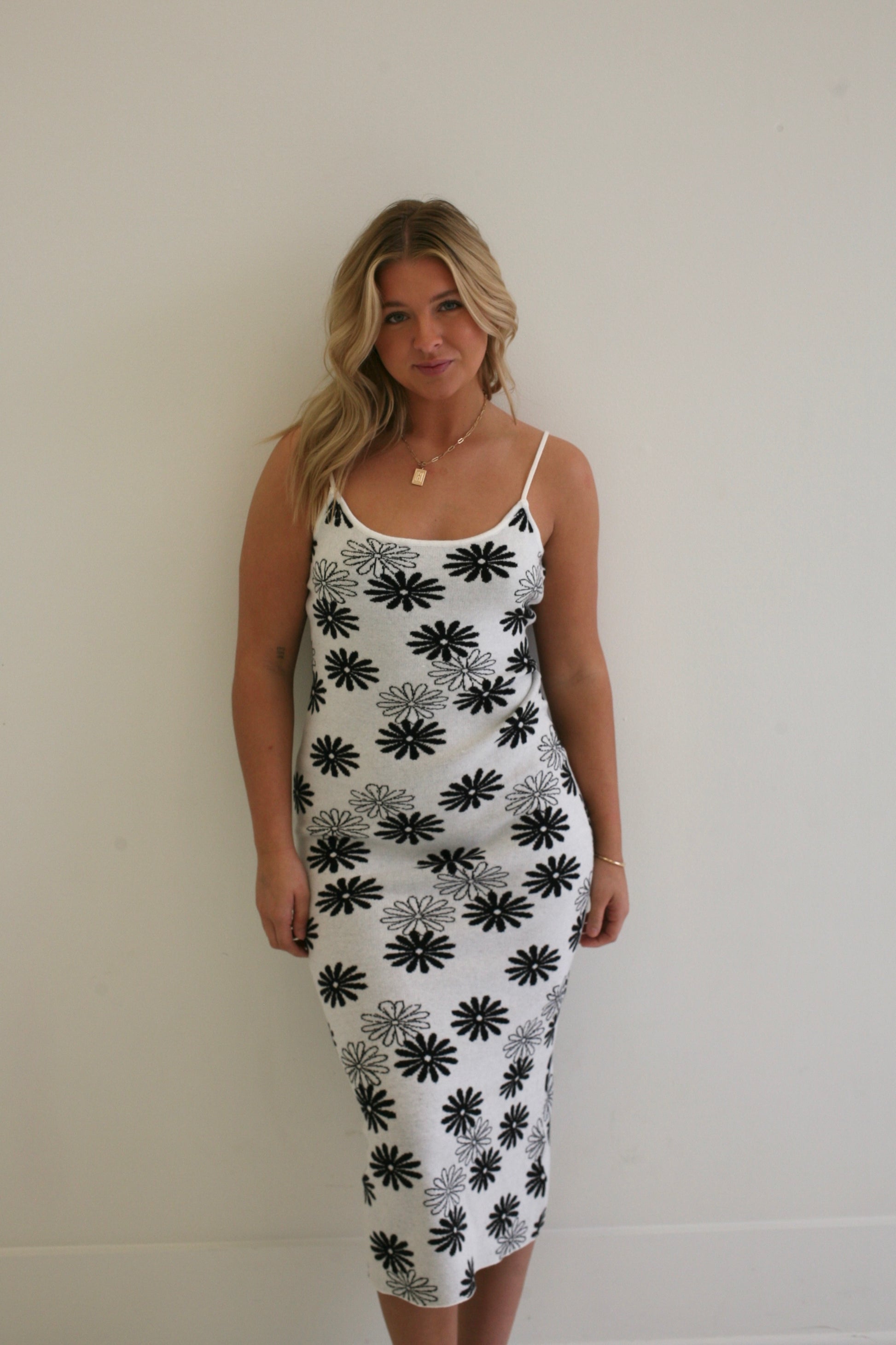 Elevate your style with this stunning midi length dress that features a timeless black and white floral design. Crafted from a high-quality knit material, this dress offers a soft and stretchy feel that moves with your body for maximum comfort. The adjustable straps allow you to customize the fit to your liking, ensuring a perfect fit for different body types. The stretchy knit fabric also provides a flattering and figure-hugging silhouette that accentuates your curves in all the right places.