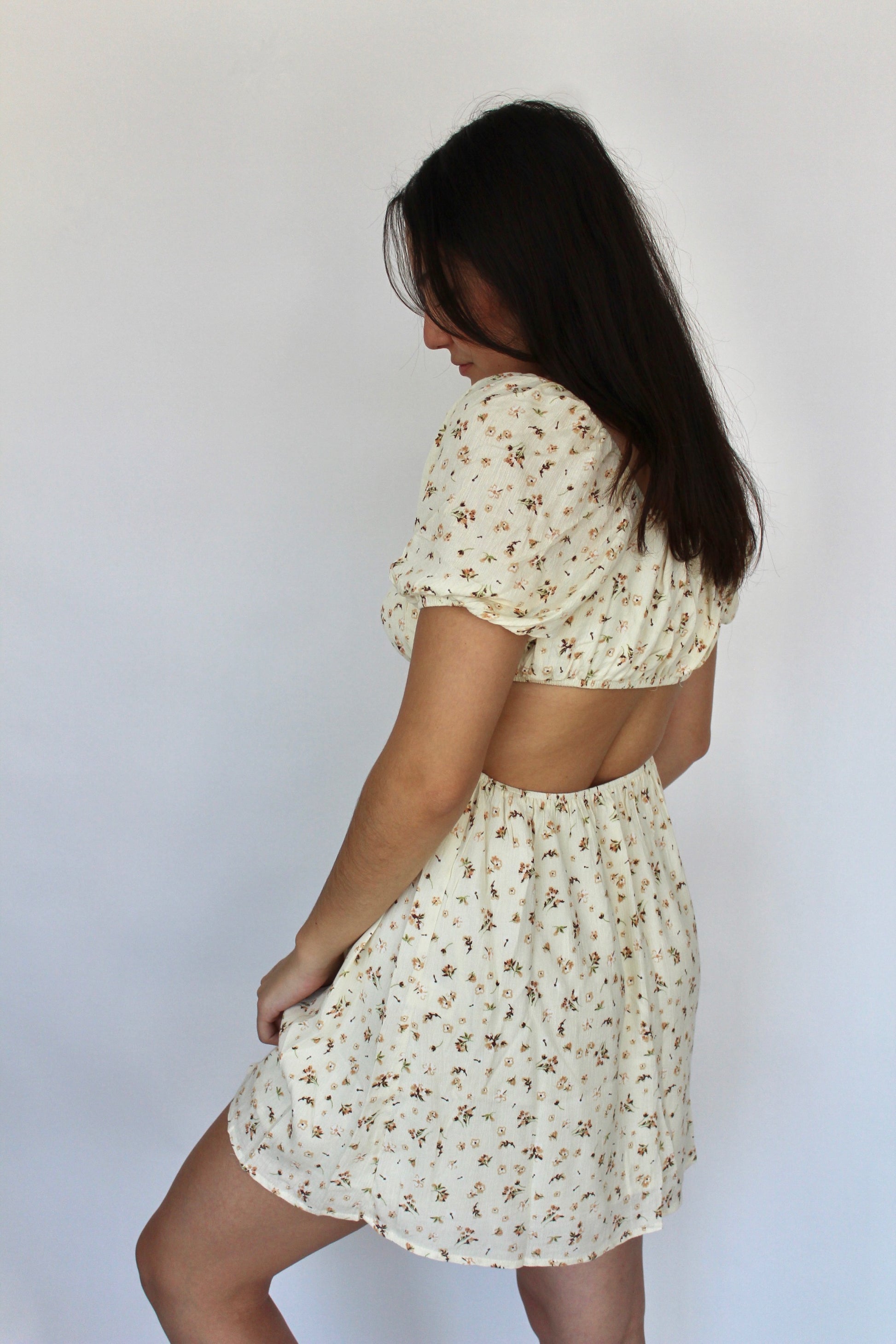 A pale yellow almost off-white colored dress with a cutout around the waist. Small floral print along dress. Elastic band around waist and chest for optimal comfort.