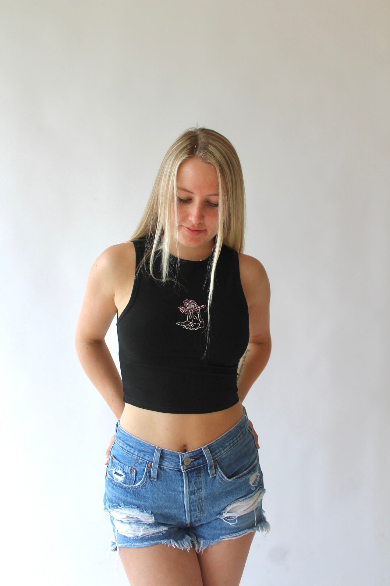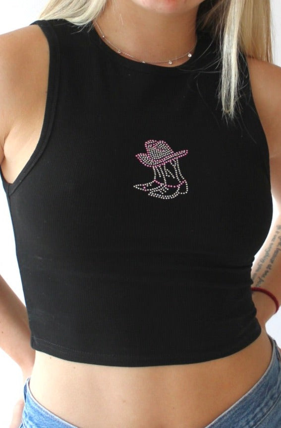 Yeehaw! Get ready to put on your dancin' boots and hit the rodeo in this Howdy Tank! This cool black ribbed tank features some serious bling - a bedazzled image of cowboy boots and a hat - so you can stand out from the pack. Ready to get your country-western on? Saddle up!