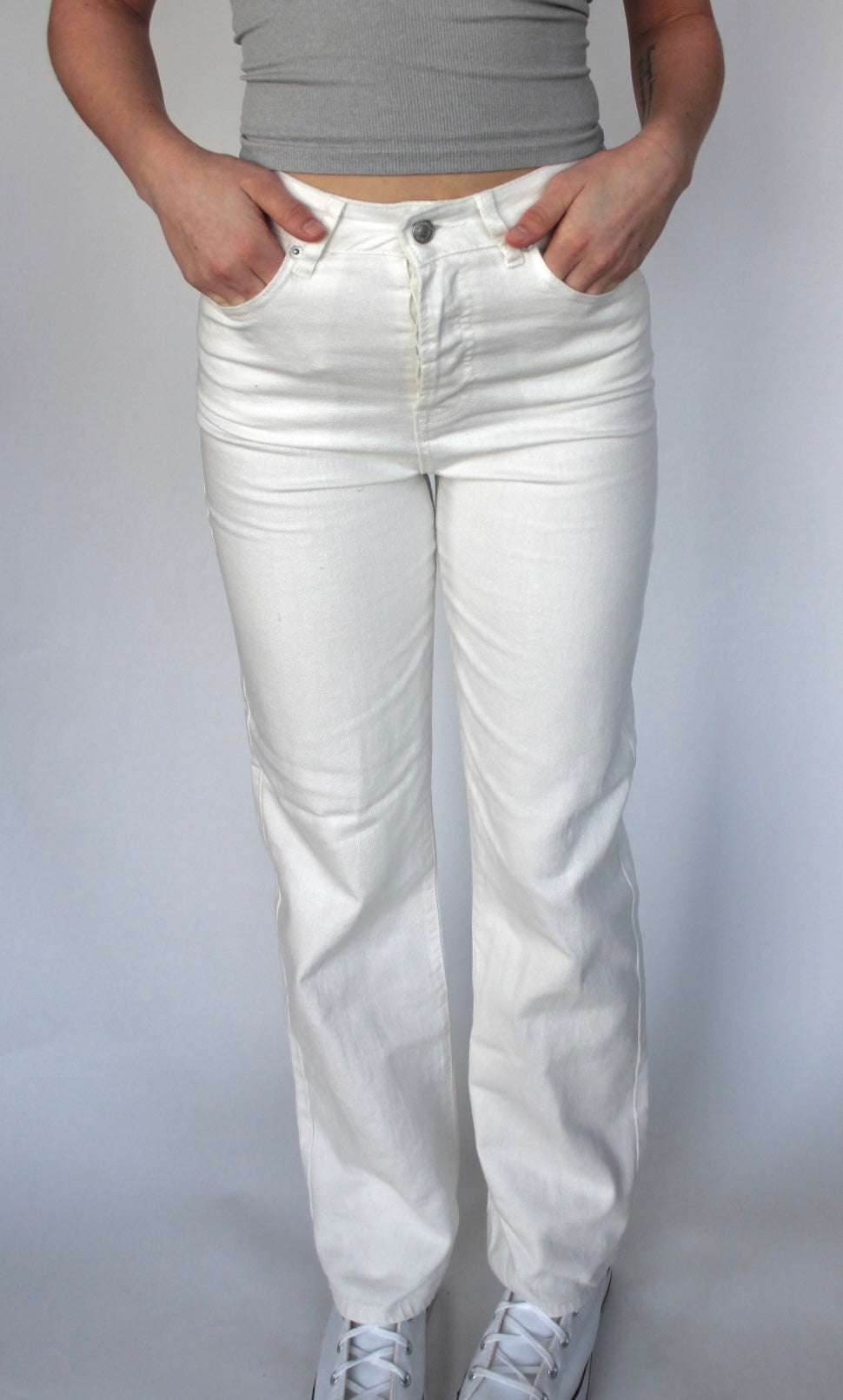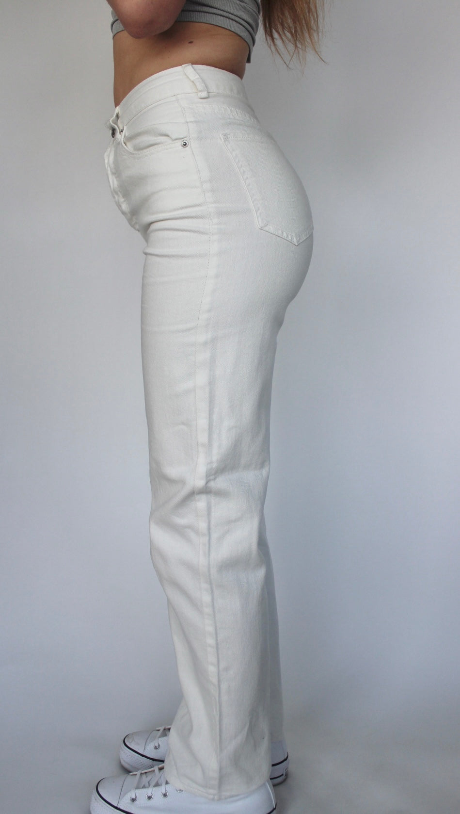 Off-white super hi-rise jeans with button fly and flare legs. Real no stretch denim feel. 31" Inseam, 12" Ultra High Rise, 17" Leg Opening Runs slightly small, size up!