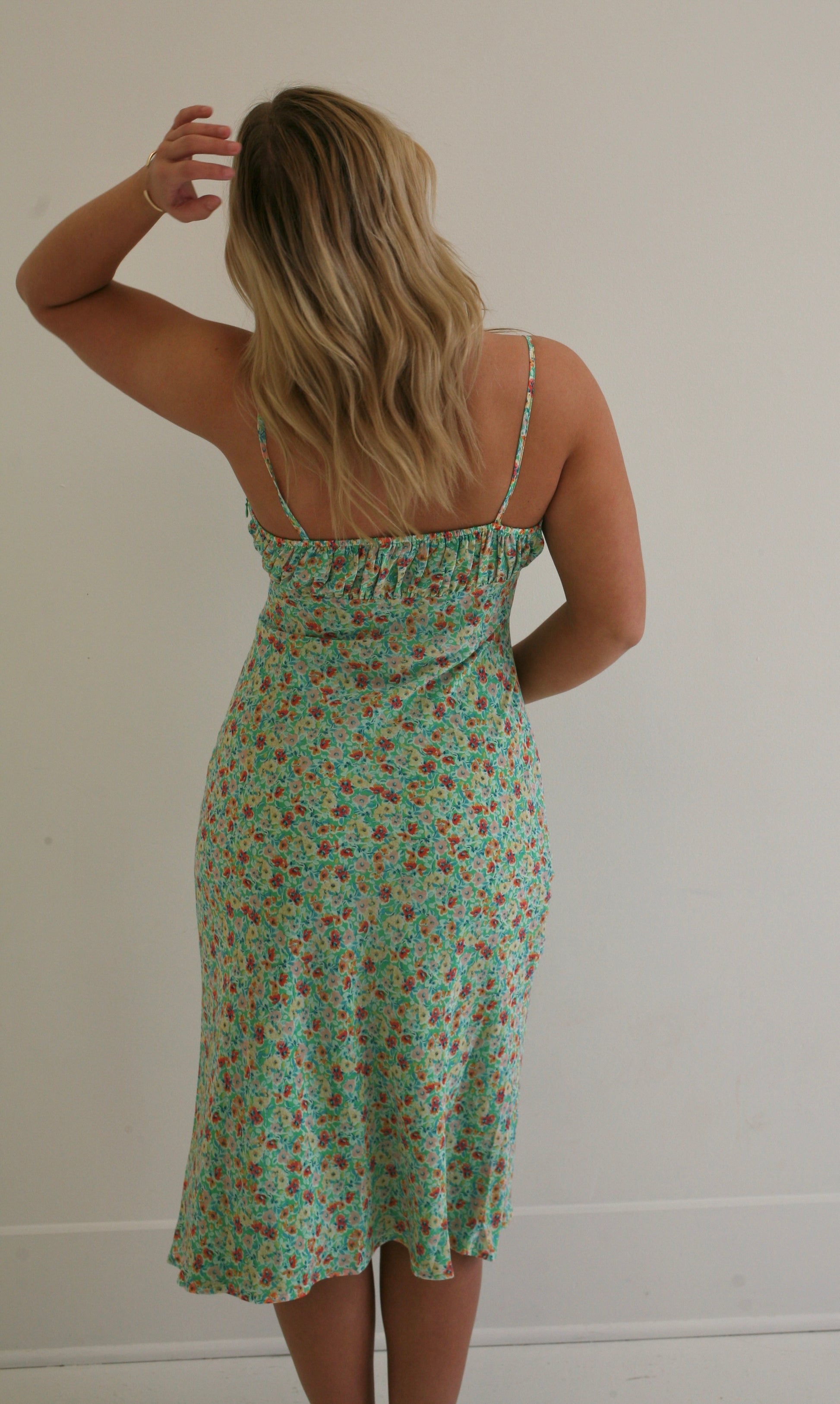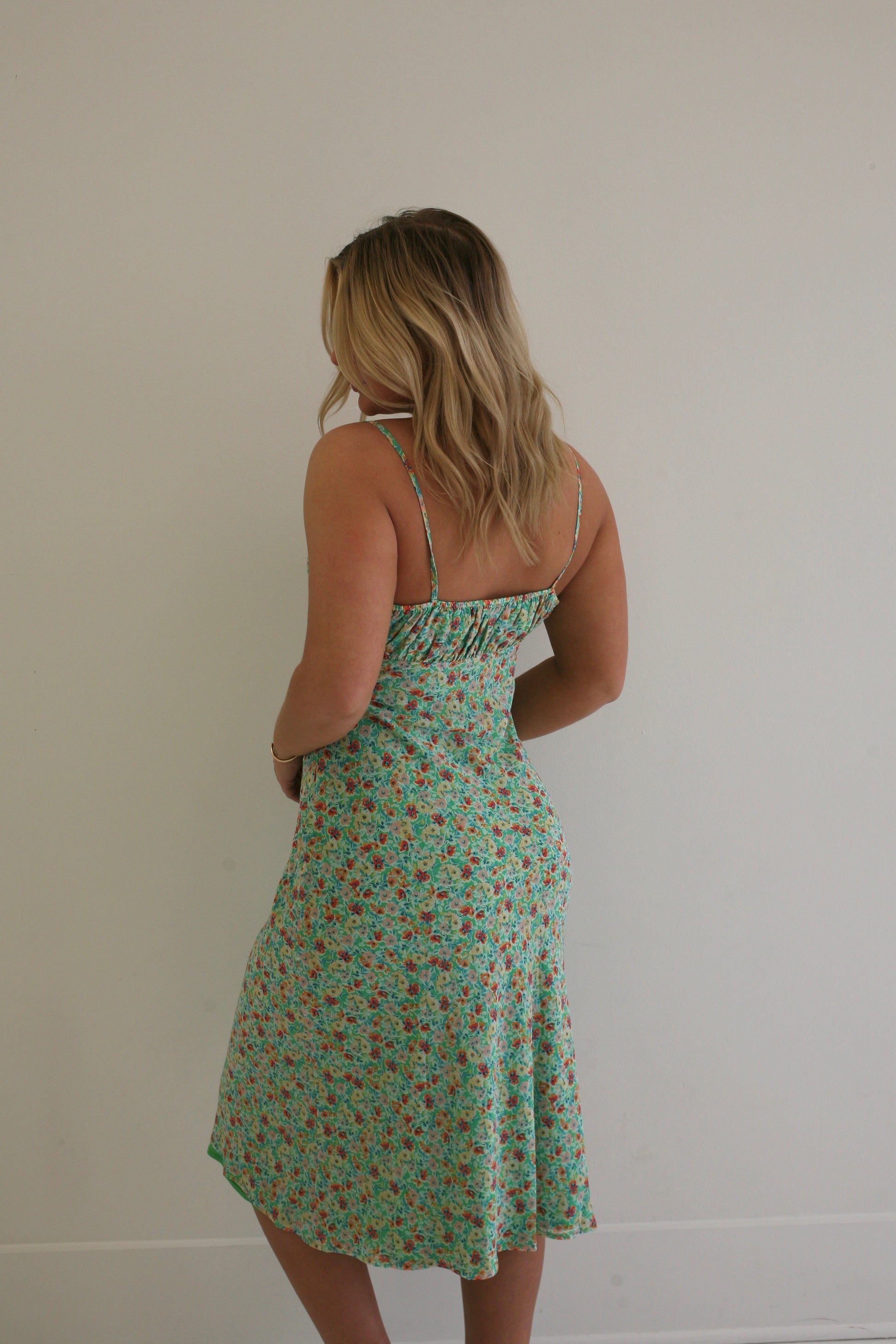A green midi length dress with a floral pattern is a stunning and feminine dress that is perfect for a variety of occasions. The dress is made from a soft and flowy material that drapes beautifully and creates a flattering silhouette. The dress also features a front tie that can be adjusted to create a customized fit and a zipper closure on the side.