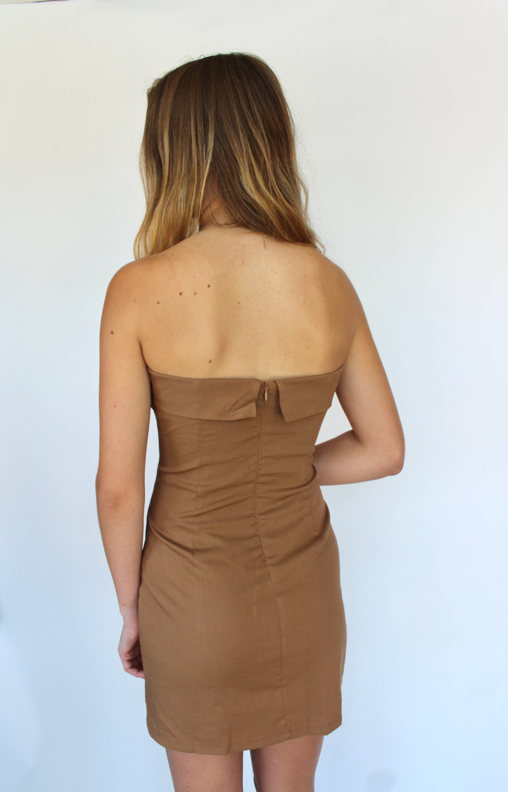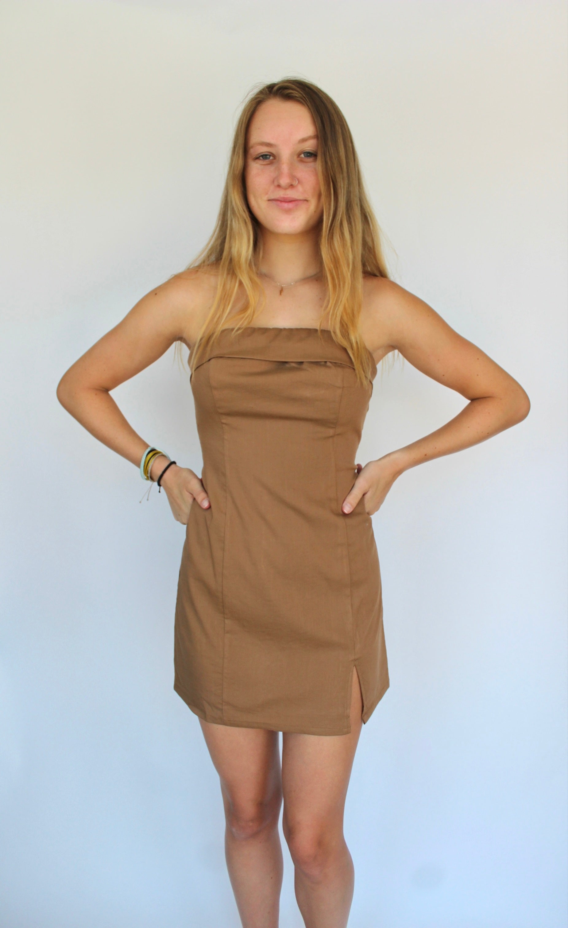 Light brown colored strapless mini dress. Folded top and side slit. Rubber lining to keep dress from falling down.