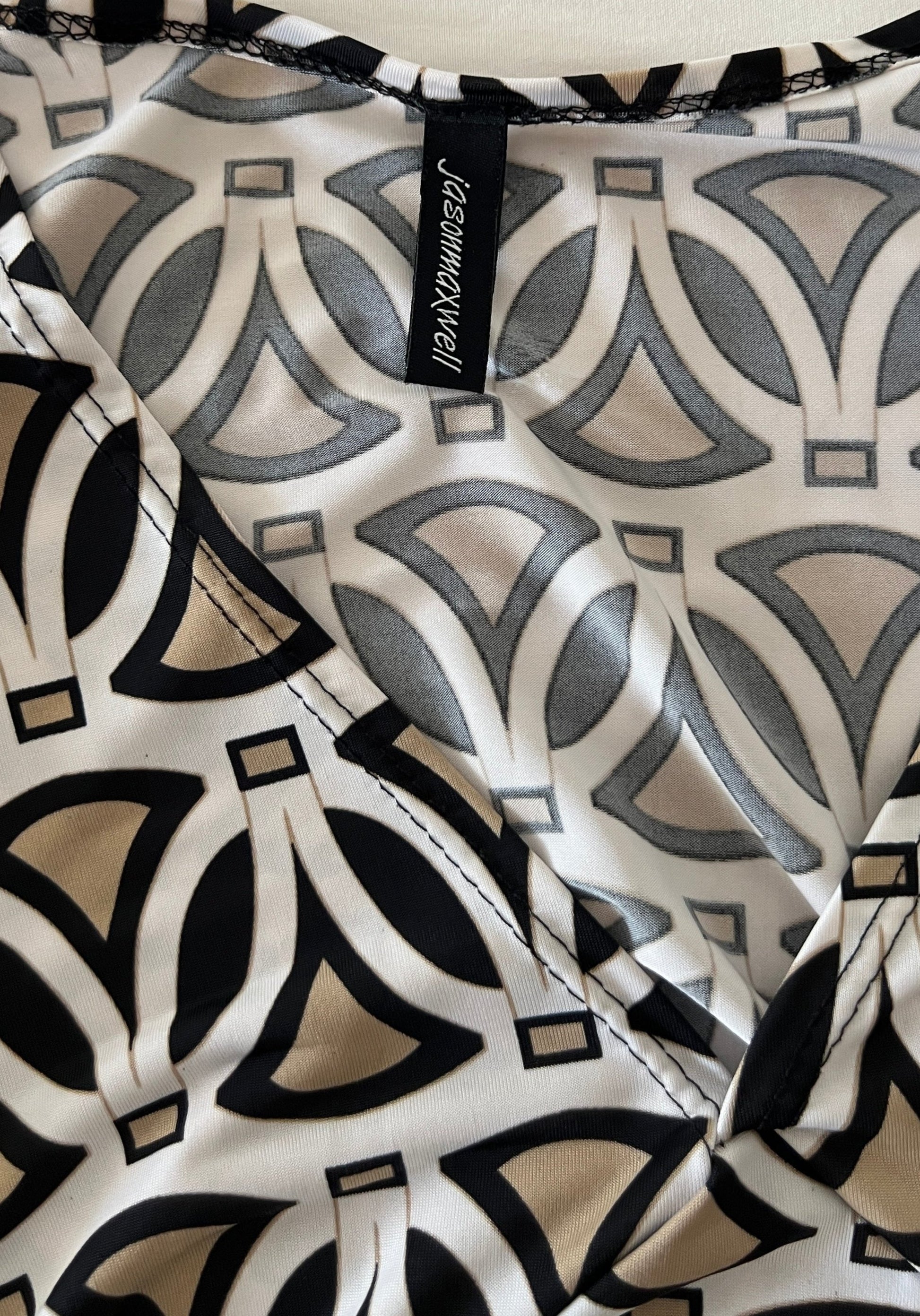 With a playful triangular design in black and brown, cap sleeves, and unique ties and ruching on both sides, it's sure to make a statement. Plus, it's environmentally-friendly as a second hand item. Fits a size small or extra-small. Pit to pit is about 16"